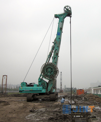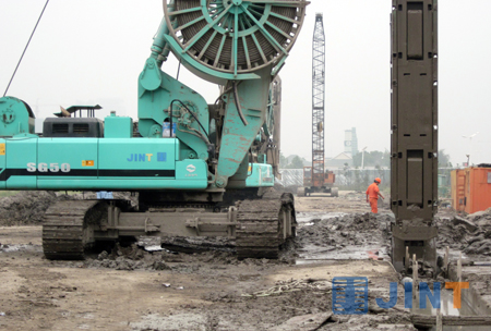該工地基坑設(shè)計(jì)深度25米,連續(xù)墻寬度1米、深度40~50米。由于地層復(fù)雜,50米以上粘土層、細(xì)沙層、卵石層交錯(cuò),承壓水深,臨近地鐵要求施工震動(dòng)小等因素,給施工帶來不小困難。施工單位華東建設(shè)基礎(chǔ)工程有限公司,引進(jìn)我公司SG35、SG40A、SG50等5臺液壓連續(xù)墻抓斗和其他廠家兩臺設(shè)備,憑著優(yōu)越的性能、良好的可靠性和出色的效率,金泰抓斗以每臺每天開挖200~250方的速度,晝夜奮戰(zhàn)工地前線,按時(shí)完成施工任務(wù),得到施工單位的充分肯定,形成鮮明對比的是工地上其他廠家的抓斗施工效率僅為金泰抓斗的三分之二。