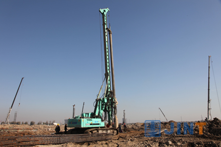 2010年10月4日,在上海金泰北京區(qū)域經(jīng)理周定亮的引領(lǐng)下,記者一行來到了位于北京市昌平區(qū)回龍觀的北京地鐵8號線二期工程土建施工07合同段。北京地鐵8號線二期工程土建施工07合同段為平西府車輛基地,位于8號線線路北端終點,與二期工程線路終點站回龍觀東大街站接軌,平西府車輛段基地隨二期工程建成。整個工程于2010年5月開工,計劃于2012年底全部竣工并通車試運營。記者細數(shù)了一下,整個作業(yè)區(qū)總共匯集了6種品牌的旋挖鉆機,其中來自上海金泰的SD20A型旋挖鉆機表現(xiàn)格外搶眼。據(jù)周定亮介紹,要完成此工地的鉆孔任務(wù),其他品牌旋挖鉆機的回轉(zhuǎn)扭矩都需要在200kNm以上,只有上海金泰的SD20A型旋挖鉆機在回轉(zhuǎn)扭矩僅為200kNm完成了鉆孔任務(wù),而且成孔速度毫不遜色。